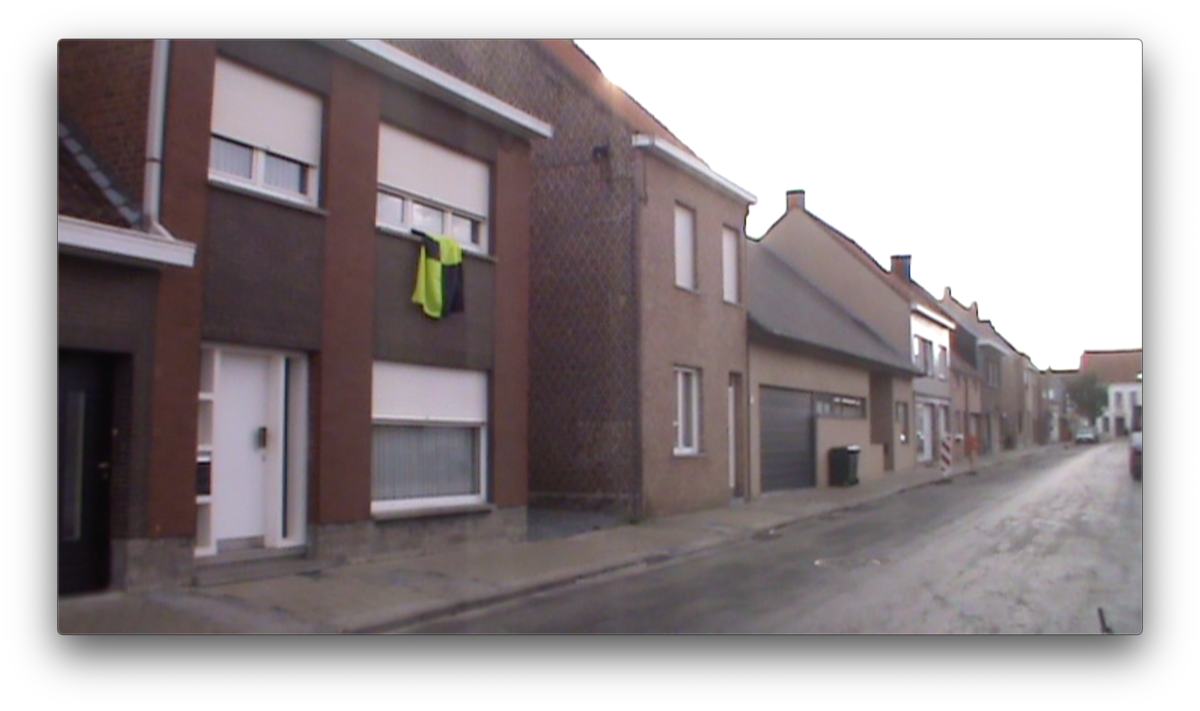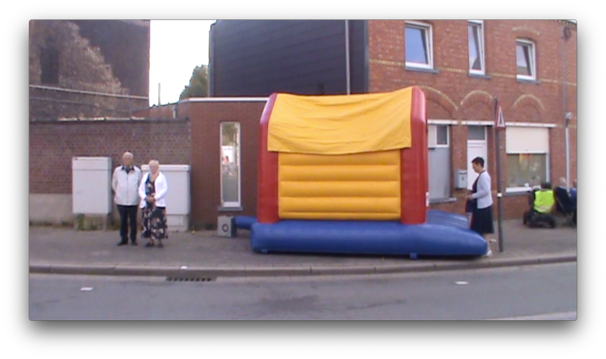 We arrive in Bavikhove by a similar route as last time: biking from Kortrijk along the river until the mushroom farm. There there is a crossroad that leads into the town. As we approach the center the town seems just as empty and quiet as the last time. The only difference this time is the flags hanging from windows of some of the sleepy houses. It is only when we approach the street of the church and school that we see barriers set up and people passing by. There are a couple bars open with outdoor seating and two bouncy castles for kids. On the main square in front of the church there is a big stage set up and behind it a small theme park with one big ride which spins like the hands of a clock, a small carousel, bumper cars and two trailer with games and prizes, and one fries stand. There are loud screams from the spinning ride mixed with music blasting from speakers and the sounds of games being won and lost. There are not very many people, mostly kids playing with games set up for them and people sitting at bars. After spending some time in the main square we go further from the center to the natural reserve where the men were cutting grass last time. The streets are empty as before, the loud sounds of the festivities fade and lightly echo through the empty streets. We pass the mushroom farm but all of the garage doors are closed. As we make our way back towards the town the sound tests for the concerts overlap with the chiming of the church bells. We pass the main square towards what looks like the local dance hall. We come into what looks like a school gymnasium, where some school celebration is finishing up. There are round tables set up and on the other side there are teenagers dancing on tables in the background of men who are folding up tables and benches to put them to storage. There is loud music and the dj plays his last song. Everyone is invited to continue the celebration at the main square where concerts are scheduled to begin. In the main square there is now more people then before, gathered in front of the stage. The concert begins, and behind the stage the rides continue. Biking away from the center through the mostly empty streets, the sounds of the concert fades.