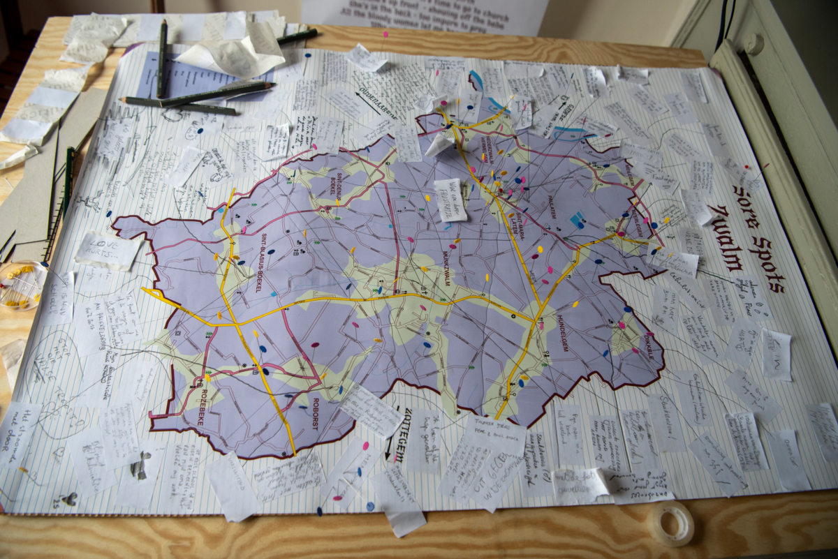 Aan de grondslag van Sore Spot Songs ligt een workshop waarbij ze samen met een groep inwoners de pijnpunten van de Zwalmstreek in kaart brachten. Daarbij gaven ze speciale aandacht aan de sore spots die ontstaan vanuit onze identiteit van man, vrouw of non-binaire persoon. Een middag lang werden verhalen van verdriet en twijfel, maar ook troost en thuiskomen gedeeld met elkaar. Het resultaat was te zien op een kaart, ontworpen door Myrna D’Ambrosio. Voorbijgangers die een link met Zwalm hebben, werden uitgenodigd om ook hun eigen verhaal te delen op de kaart. Van deze verhalen maakten Sarah en Esther een lied – een sore spot song - die te horen was in de kapel.