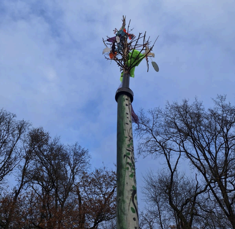 Figure 11 (left): Drawing from the calendar by Carole de Buck, depicting the hotel where, in a speculative move, the banner held up is not anti-migration but reads ‘in this hotel, everyone is welcome’ 2025. Figure 12 (right): Photo of the Sint Arbera tree/patron saint, by the authors.