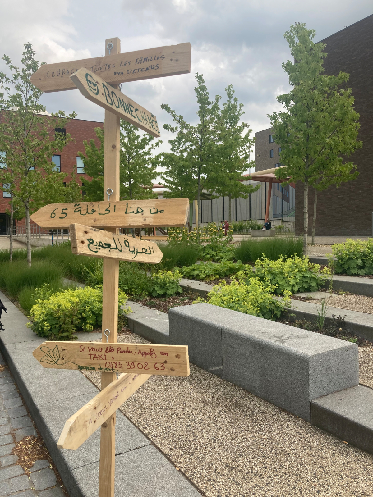 Nu de gevangenis er daadwerkelijk staat, probeert het buurtcomité zich te verhouden tot deze nieuwe realiteit – niet langer tegen, maar met de gevangenis. Onder het motto “we zijn allemaal buren” organiseren ze sinds twee jaar een samenkomst bij de ingang van de gevangenis, waarin ze openlijk de vraag stellen hoe de gevangenis en Haren naast elkaar kunnen bestaan. Met Kunstenplatform PLAN B namen we deel en bedachten we een kleine interventie waarbij bezoekers en bewoners wegwijzers konden maken rond de vragen: “Wat kan Haren voor jou doen?” en “Wat heb jij hier nodig?” De antwoorden waren concreet - een taxi, een busverbinding - maar ook verrassend persoonlijk, met boodschappen als “Courage à toutes les familles des détenus.”