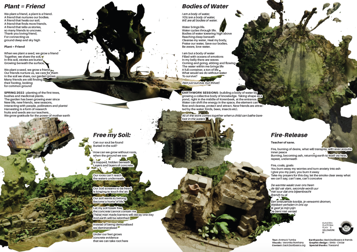 Ánima O. Cassamajor en Back2SoilBasics gaven vorm aan een poster die hun relatie met de natuur, voedsel en de bodem aftast. Van poëzie tot simpele waarheden als "Plant = Friend". Dit deden ze voor hun Veldwerk III onderzoek vanuit het Molenbeekse Korenbeek: een tijdelijke plek in een oude school, waar ze ecologie toegankelijk maken voor zij die hier vanwege systemische onderdrukking minder toegang tot krijgen.