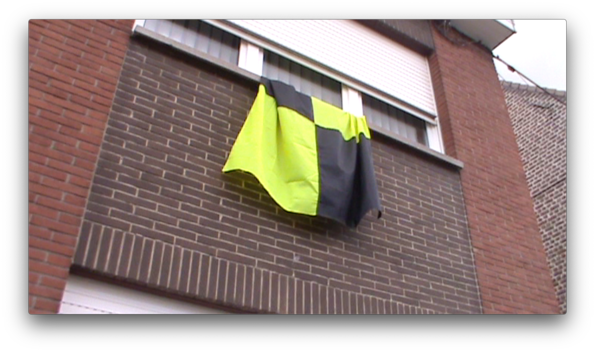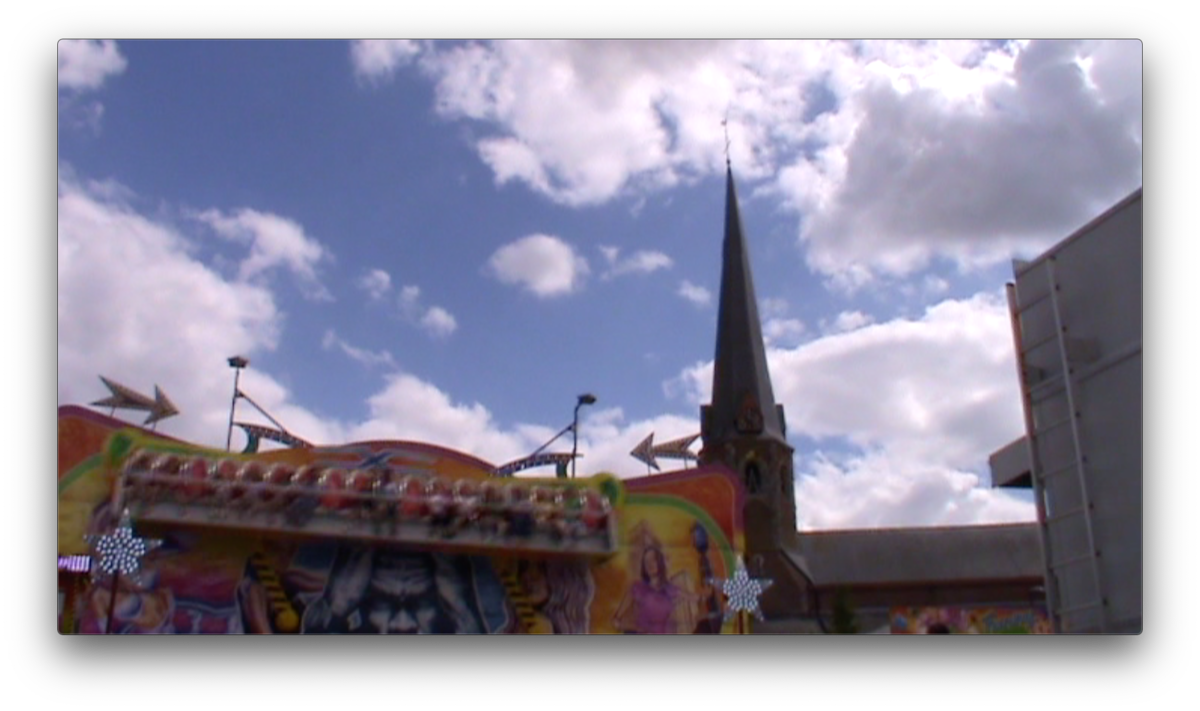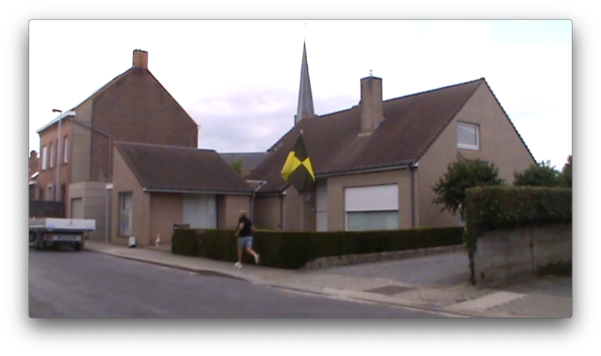 We arrive in Bavikhove by a similar route as last time: biking from Kortrijk along the river until the mushroom farm. There there is a crossroad that leads into the town. As we approach the center the town seems just as empty and quiet as the last time. The only difference this time is the flags hanging from windows of some of the sleepy houses. It is only when we approach the street of the church and school that we see barriers set up and people passing by. There are a couple bars open with outdoor seating and two bouncy castles for kids. On the main square in front of the church there is a big stage set up and behind it a small theme park with one big ride which spins like the hands of a clock, a small carousel, bumper cars and two trailer with games and prizes, and one fries stand. There are loud screams from the spinning ride mixed with music blasting from speakers and the sounds of games being won and lost. There are not very many people, mostly kids playing with games set up for them and people sitting at bars. After spending some time in the main square we go further from the center to the natural reserve where the men were cutting grass last time. The streets are empty as before, the loud sounds of the festivities fade and lightly echo through the empty streets. We pass the mushroom farm but all of the garage doors are closed. As we make our way back towards the town the sound tests for the concerts overlap with the chiming of the church bells. We pass the main square towards what looks like the local dance hall. We come into what looks like a school gymnasium, where some school celebration is finishing up. There are round tables set up and on the other side there are teenagers dancing on tables in the background of men who are folding up tables and benches to put them to storage. There is loud music and the dj plays his last song. Everyone is invited to continue the celebration at the main square where concerts are scheduled to begin. In the main square there is now more people then before, gathered in front of the stage. The concert begins, and behind the stage the rides continue. Biking away from the center through the mostly empty streets, the sounds of the concert fades.