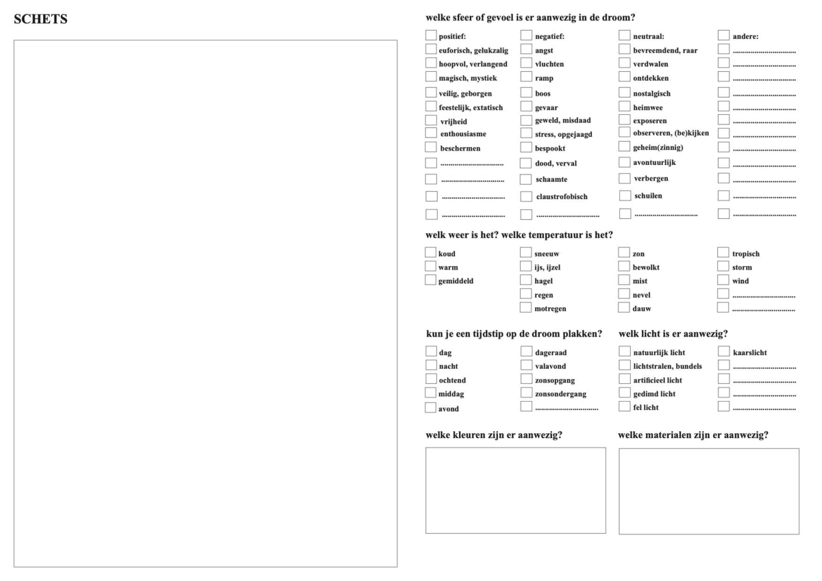 Tijdens de route vraag ik bewoners een droomlogboek bij te houden om verder in gesprek te gaan over de gedroomde ruimtes. Door hun te vragen naar ruimtelijke details en ervaringen kan ik de ruimtes stap voor stap reconstrueren.
