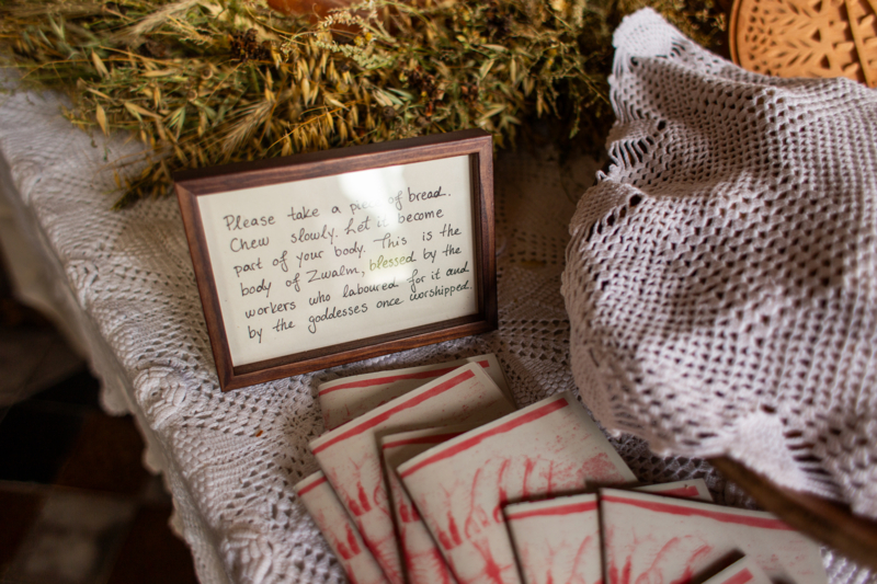 Deze evenementen vormden de basis voor hun installatie in een kapel. Door tradities van het land te vermengen met die van kunstenaars, daagt het werk koloniale en kapitalistische relaties met de aarde uit en biedt het een intersectioneel perspectief op ecologie, gemeenschap en ritueel.