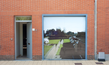 Foto 1: Marijke en Noël in Bekegem © Emma Keppens. Foto 2: Print op de garagepoort van Marijke en Noël ter voorbereiding van de presentatie van Zoals mij gewoon is © Maite Vanhellemont.