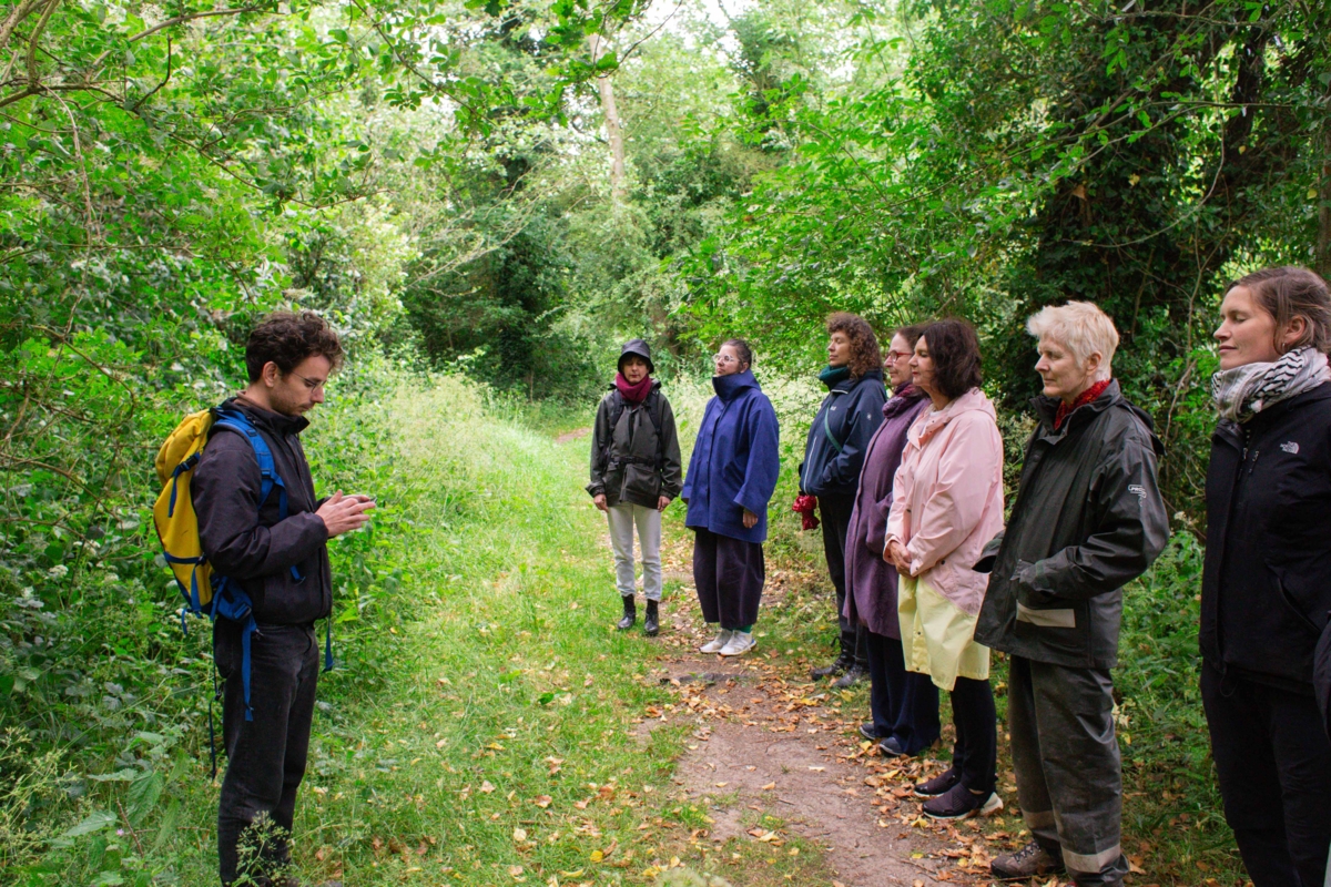Kunstcollectief Seasonal Neighbours werkt voor Kunst & Zwalm ‘25 aan een project met de werktitel “Het compost en het nest”. Daarbij gaan ze aan de slag met de vraag wat het betekent elkaars plekken te bewonen; samen met mensen, dieren, planten en alles daartussenin. Op 5 juni organiseerden ze een avond waarbij ze een groep mensen in woord, beeld, en acties meenamen in dit thema. Samen maakten we een luisterwandeling doorheen het Zwalmse landschap en bekeken we een kortfilm waarin dieren de hoofdrol speelden.