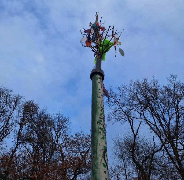 Figure 11 (left): Drawing from the calendar by Carole de Buck, depicting the hotel where, in a speculative move, the banner held up is not anti-migration but reads ‘in this hotel, everyone is welcome’ 2025. Figure 12 (right): Photo of the Sint Arbera tree/patron saint, by the authors.