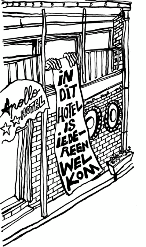 The practice of cultivating days of remembrance, in this case with Hotel Apollo Day, allowed us as village dramaturgs to tend to the process of emerging thoughts (in this case: memories) of the village. Hotel Apollo Day was as much inspired by the violence of June 30th, as by the solidarity movement it sparked. (Former) inhabitants raised money to buy toys for the children living in the center. In an attempt to feed the undercurrent of solidarity in the calendar, we imagined how the hotel could once again become a symbol of hospitality on this day. Therefore, Carole de Buck (2025) made a drawing of a banner, rolled out from the hotel, saying: ‘In this hotel, everyone is welcome’, reversing the discourse of the Voorpost occupiers (see Figure 11). Thus we attempted to make a painful history visible, but also to formulate an alternative future in which rural spaces could be an environment for solidarity and that are capable of welcoming difference.