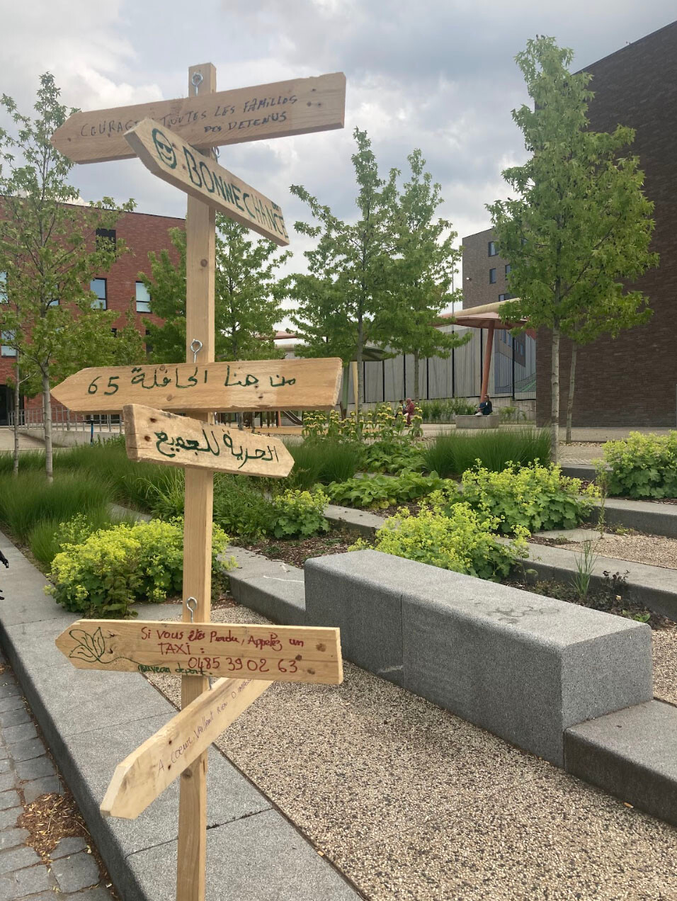 Now that the prison has been built, the neighborhood committee is coming to terms with this new reality – no longer against, but with the prison. Under the motto “we're all neighbors,” they have been organizing a gathering at the prison entrance for the past two years and are openly wondering how the prison and Haren can coexist. Figure 4 shows the authors’ photo of their latest gathering in 2025. With Kunstenplatform PLAN B, we joined this gathering and created a small intervention where visitors and residents could make signposts in response to the question ‘What can Haren do for you? What do you need here?’. Needs were specific: a taxi, a bus service, but also surprisingly personal. As depicted in Figure 5, small messages such as ‘Courages a toutes les familles des détenus’ adorned the signs. The signs became not only a collection of needs, but also messages to others: visitors with whom they felt connected, and prisoners serving sentences who will one day leave the prison disoriented. Over two days of conversations at the entrance, it became clear there was a need for communication across the walls.