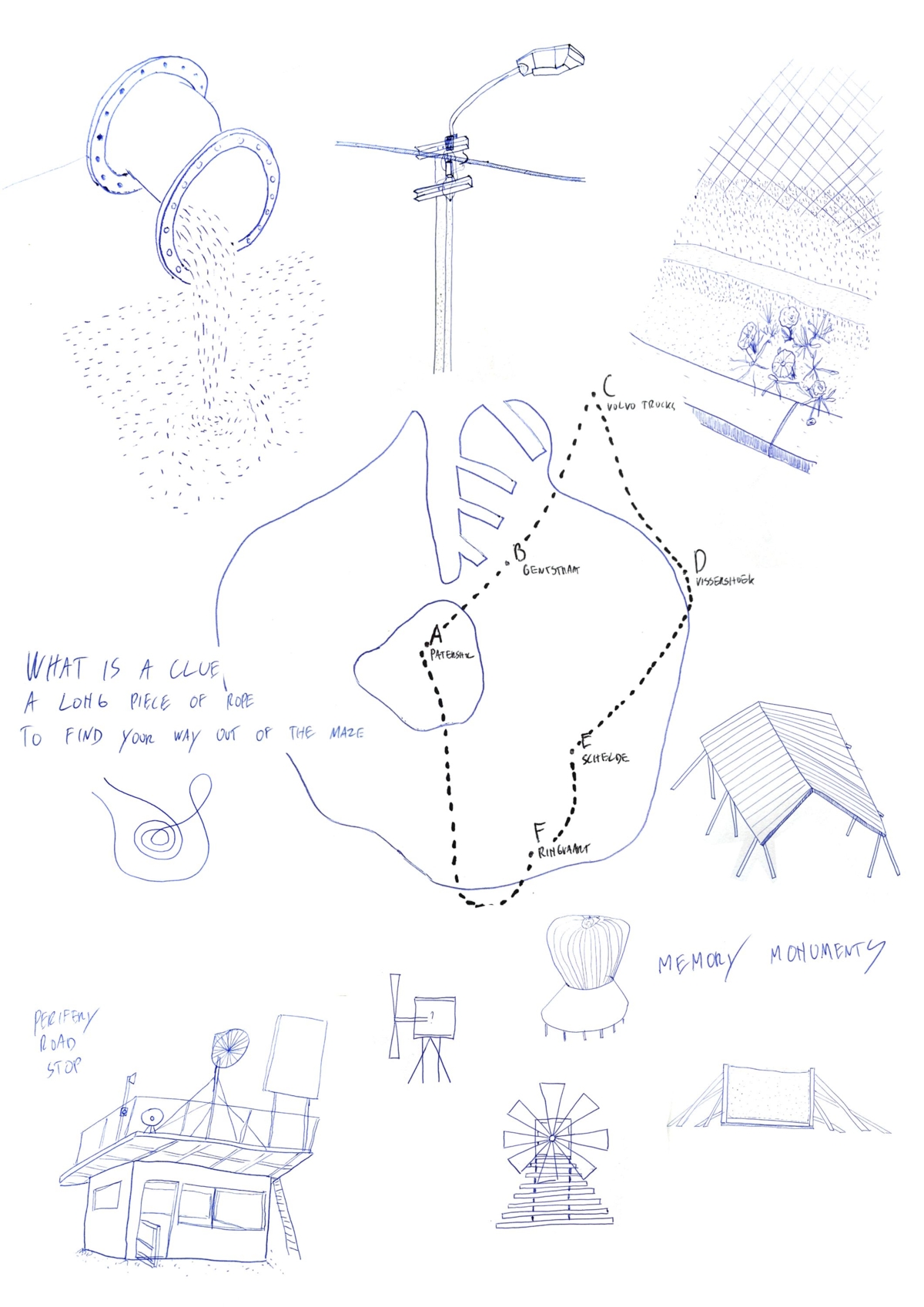 Ik heb enkele schetsen gebundeld die ik de afgelopen maand maakte (zie bijlage). Het zijn interpretaties van wat ik zag, op het moment zelf of later, alsook simpele structuren die uit mijn geheugen komen en die ik graag eens op papier zet for the fun of it. Het leek me wel interessant na te denken over wat er gebeurt als ze gebundeld worden, wat het wilt zeggen als die structuren samen komen, en waarom pen ik ze in godsnaam neer? Graag maak ik er veel meer: het gevoel een subjectieve database te creëren zonder absolute parameters vind ik aantrekkelijk.