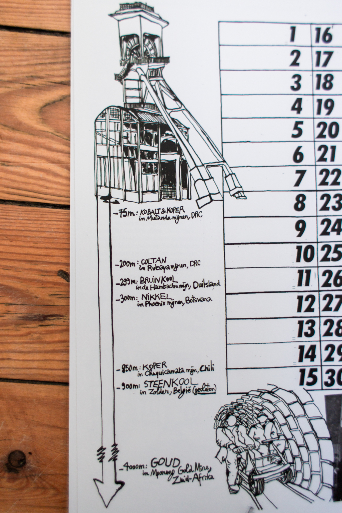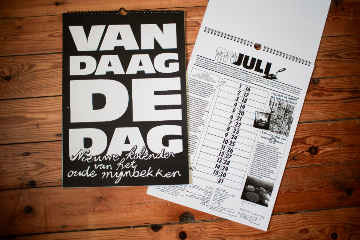 Vandaag de dag: nieuwe kalender van het oude mijnbekken is een kalender die bestaande en nieuwe herinneringsdagen uit het voormalige Limburgse mijngebied verzamelt. Deze komt voort uit een tweejarig traject waarbij Martha Balthazar en Vivi Focquet zich lieten rondleiden in de Limburgse mijnstreek. Vanuit een fascinatie voor het gedeeld geheugen van de streek, en dan vooral de vraag hoe dit ontstaat en wie daar wel en niet aan kan bijdragen, begonnen ze hun gesprekken met de opener “Wat of wie moet er hier herinnerd worden?”. Uit al die gesprekken ontstond deze kalender, ontworpen en geïllustreerd door Carole De Buck. Het is een collectief voorstel voor een nieuwe, meer open, en gedragen herinneringscultuur. Er zijn nog blanco dagen, dus aanvullen en aanpassen is steeds mogelijk.